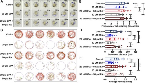 The addition of FA can improve the abnormal movement behaviors of zebrafish embryos or larvae induced by exposure to BPA. (A) A stereo fluorescence microscope was used to record a video of the tail oscillatory movement of zebrafish embryos at 24 hpf. The sequence of pictures shows intervals of 30 seconds. (B) The frequency of tail oscillation was calculated for the 24 hpf embryos. (C) The movement trajectory, (D) total movement distance and (E) average speed of 6dpf larvae within a 10-minute period were also analyzed. Significance levels are denoted as follows: *P<0.05; **P<0.01; ***P<0.001; ****P<0.0001. Error bars represent the standard error of the mean. |