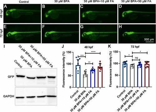 The neuron-specific GFP expression in transgenic tg(elavl3:GFP) zebrafish larvae exposed to BPA was reversed by FA. (A-H) The fluorescence intensity of neuron-specific GFP in the brain and spinal cord was measured at 48 hpf and 72 hpf. (I) Western blot analysis was performed to detect the expression of the GFP protein in transgenic tg(elavl3:GFP) zebrafish larvae at 48 hpf (n=50). (J-K) It was observed that the FA supplementation group significantly reversed the fluorescence intensity (n=9). Significance levels are denoted as follows: *P<0.05; **P<0.01; ***P<0.001; ****P<0.0001. The error bars in the figures indicate the standard error of the mean. |