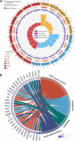 The KEGG enrichment analysis was performed on DEGs in zebrafish larvae at 5 dpf after exposure to BPA and FA supplements, as detected by RNA-seq. (A) The KEGG enrichment circle diagram shows the top 20 enriched pathways in the outer circle, with the number of genes indicated by the coordinates. The second circle represents the background gene count and P value, with longer bars indicating a higher number of genes. The third circle shows the number of DEGs in each pathway, while the innermost circle displays the Rich Factor value for each pathway. (B) The chordal diagram of enriched pathways highlights DEGs related to the MAPK, PPAR, apoptosis, and peroxisome pathways, all of which are associated with the nervous system. |