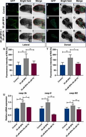 FA can prevent the apoptosis of brain cells caused by BPA in zebrafish larvae. The lateral view (A-I) or dorsal view (J-R) of the brain regions in zebrafish larvae was examined using acridine orange staining to observe the impact of FA on inhibiting BPA-induced apoptosis in zebrafish larvae at 5 dpf. Apoptotic cells were identified by green fluorescence through acridine orange staining. The red dotted area in (C, F, I, L, O, and R) indicates the region of interest (ROI). Quantitative analysis of green fluorescent intensity in the head region of zebrafish larvae was conducted in both lateral view (S) and dorsal view (T). The data were expressed as the mean ± standard error (n = 9). Scale bar: 100 μm. (U) The mRNA expression of relevant genes was verified via qRT-PCR. The data were shown as the mean ± standard error (n = 50), with significance levels denoted as *P<0.05, **P<0.01. |