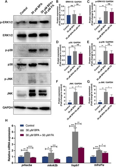 FA supplementation affects the expression of proteins and genes in the MAPK signaling pathway in the presence of BPA. (A) Western blot analysis was performed to detect the expression of MAPK signaling pathway activation-related proteins in 5 dpf zebrafish larvae following exposure to BPA and supplementation with FA. The results of statistical analysis are shown in (B-G). Additionally, mRNA expression of relevant genes in the MAPK signaling pathway was verified using qRT-PCR in (H). The data is shown as mean ± standard error of three replicates (n = 50), with significance levels denoted as *P<0.05, **P<0.01, ***P<0.001, and ***P<0.0001. |
