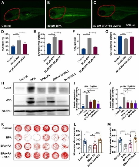 The abnormal motor behavior in zebrafish larvae induced by BPA is alleviated by FA through the ROS/JNK pathway. (A-D) The levels of ROS were measured in zebrafish larvae at 120 hpf using a DCFH-DA fluorescent probe (10 μM). The red dotted regions indicate areas where the fluorescence intensity was statistically analyzed to determine ROS levels (n = 9). (E-G) The levels of LPO (nmol/mg protein), H2O2 (μmol/g), and CAT (units/mg protein) were also measured in zebrafish larvae at 5 dpf (n = 100). (H-J) The inhibitory effects of FA and NAC on the activation of JNK/p-JNK protein levels in zebrafish larvae at 5 dpf were observed (n = 50). BPA, 30 μM; FA, 50 μM; NAC, 5 μM. (K-M) FA and NAC were found to have a synergistic effect in rescuing abnormal motor behavior, movement distance, and average movement speed of zebrafish larvae at 5 dpf after exposure to BPA (n = 18). BPA, 30 μM; FA, 50 μM; NAC, 5 μM. The data are presented as mean ± standard error. Statistical significance was denoted as *P<0.05, **P<0.01, ***P<0.001, and ****P<0.0001. |