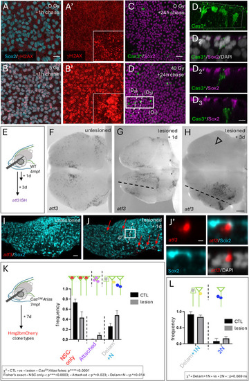 CasCREAtlas reveals non-apoptotic caspase events during pallium development and homeostasis. (A) Experiments carried out in the present study shown in relation to the zebrafish lifetime. (B) Schematics of the transgenic lines used. CasCREAtlas combines an NP/NSC-specific driver line (top and middle) expressing Cre upon Cas3*/Cas7* cleavage and a reporter line (bottom) expressing hmg2bmCherry upon Cre recombination. mCD8, membrane anchor; V5, antigen segment (tag); DEVD, canonical Cas3*/Cas7* cleavage site; GSGC, non-productive cleavage site; her4 prom, her4 regulatory elements. The Tg(her4:mCD8-DEVD-V5-Cre);Tg(βact;lox-stop-lox-hmg2bmCherry) background is referred to as CasCREAtlas, and Tg(her4:mCD8-GSGC-V5-Cre);Tg(βact;lox-stop-lox-hmg2bmCherry) as ‘control’. All analyses were conducted in double heterozygotes. (B′) Schematic of analyses in cross-sectioned or whole-mount pallia at 6 dpf. (C) Expression of the CasCRE driver is confined to gfap:eGFP-positive cells. Pallial cross-sections of Tg(her4:mCD8-DEVD-V5-Cre);Tg(gfap;eGFP) larvae at 6 dpf with IHC for GFP (NP/NSC), Zo1 (tight junctions, delimiting apical surfaces) and V5 (transgene tag), showing V5 (membrane anchored) and GFP in the same cells. (D-F) Hmg2bmCherry whole-mount IHC on CasCREAtlas (D) and control (E) pallia at 6 dpf (dorsal views, z-projections, anterior left); quantification of positive cells (F) (CasCREAtlas: n=4 brains; control: n=10 brains; Mann–Whitney test). (G-J) CasCREAtlas activity is induced by camptothecin (CPT). (G) Schematic of the experiment: CPT (20 µM) or DMSO was injected into the neural tube ventricle in CasCREAtlas larvae at 4 dpf; Hmg2bmCherry was analyzed at 6 dpf. (H-J) Hmg2bmCherry whole-mount IHC at 6 dpf (dorsal views, z-projections, anterior left) and quantification (J) (DMSO and CPT: n=6 brains each; Mann–Whitney test). (K-M′) Hmg2bmCherry expression in CasCREAtlas (L,L′) and control (M,M′) pallia at 1.5 mpf. (K) Schematic of whole-mount pallia at 1.5 mpf. (L-M′) Whole-mount IHC for Sox2 (NPs, NSCs and some freshly born neurons) and Hmg2bmCherry (dorsal views, z-projections, anterior left). L1 and L2 show cross-sections as indicated in L, dorsal up. Red arrows indicate Sox2neg neurons, thin yellow arrow Sox2pos neurons, and short yellow arrow a Sox2pos NSC. Scale bars: 10 µm (C-E,H,I); 50 µm (L-M′,L1,L2).