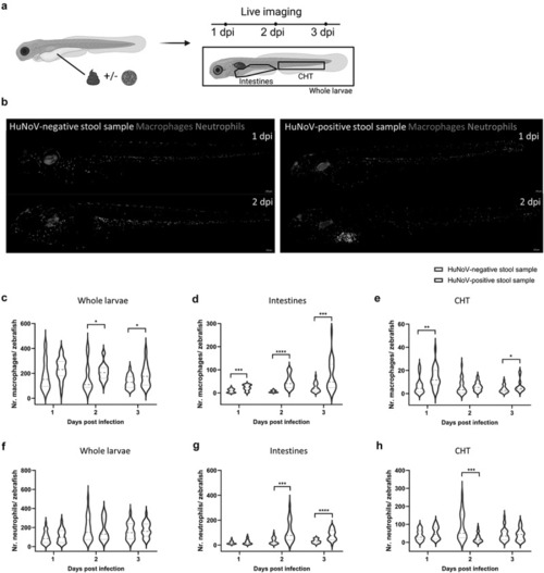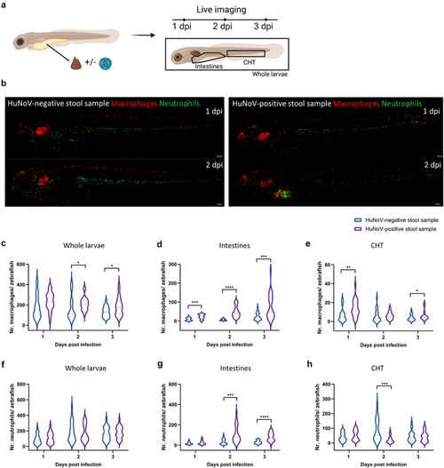 Upon HuNoV infection macrophages expand and are attracted to the intestines. (a) A schematic overview illustrating the experimental setup where zebrafish larvae were injected with either a HuNoV-negative or -positive stool sample, followed by live imaging at 1, 2, and 3 dpi. (b) Representative fluorescent images (10X magnification) of zebrafish larvae from the transgenic line Tg(fms:Gal4/UAS:nfsB:mCherry/mpx:GFP) injected with HuNoV-negative or -positive stool samples. The images show the recruitment of macrophages (red) and neutrophils (green) to the intestinal region where HuNoV infection occurs. Images were deconvoluted using leica LAS X imaging software. (c-e) quantification of macrophages in (c) whole larvae, (d) intestines, and (e) the caudal hematopoietic tissue (CHT) using ImageJ, in zebrafish injected with either a HuNoV-negative or positive stool sample. (f-h) quantification of neutrophils in (f) whole larvae, (g) intestines, and (h) the CHT using ImageJ, in zebrafish injected with either a HuNoVnegative or -positive stool sample. For panels (c-h), data from 22-24 larvae per condition are shown as violin plots with medians, with outliers removed (ROUT, Q = 1%). Statistical analysis was performed using the Mann-Whitney test, with significant differences marked by asterisks: * |