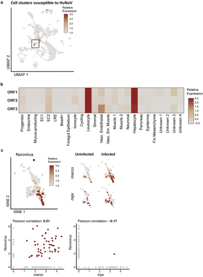 ScRNA-seq identifies enterocytes, hepatocytes, and leukocytes as host cells for HuNoV infection in the zebrafish intestines. (a) Cell clusters susceptible to HuNoV infection are highlighted and included leukocytes marked with a black box. (b) The relative expression levels of HuNoV’s ORF 1, 2, and 3 (respectively encoding for the non-structural polyprotein, VP1, and VP2) in different cell clusters are shown in detail and highlight a tropism particular for leukocytes. The average expression of each norovirus read per cell type was determined followed by a normalization across all cell types. (c) Within leukocytes, a 2D t-SNE projection of the leukocyte cell cluster shows the relative expression of HuNoV. Within leukocytes, the expression of |