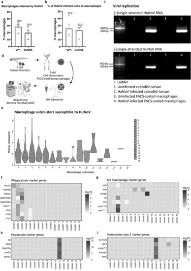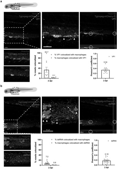 Macrophages in the intestines are infected by HuNoV and allow active viral replication. (a-b) whole mount immunohistochemistry confocal images of Tg(mpeg:mCherry-F) zebrafish larvae infected with HuNoV taken at 2 dpi at a 25X magnification focusing on the intestines using Hoechst, a primary mCherry antibody, and (a) a VP1-targeting antibody or (b) a dsRNA-targeting antibody. Cross-section views created in imaris software show horizontal and vertical sections of macrophages that contain (a) VP1 or (b) dsRNA with the white circle highlighting an infected cell of interest. Imaris 3D Colocalization software calculated the overlap of voxels between macrophages and (a) VP1 or (b) dsRNA ( |