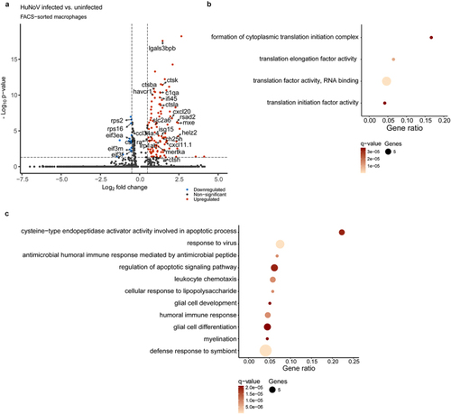 Single-cell analysis reveals inhibition of cytoplasmic translation and enhanced phagocytosis in HuNoV-infected macrophages. (a) A volcano plot shows the DEGs in HuNoV-infected vs. uninfected bystander macrophages within the HuNoV-infected zebrafish host. A vertical dotted line marks a log2(fold change) value of 0.5, while the horizontal dotted line marks a benjamini-Hochberg q-value of 0.05. Dot plot showing the pathways obtained via a ClueGO hypergeometric enrichment pathway analysis of (b) downregulated and (c) upregulated DEGs using the gene ontology - biological process database. HuNoV = human norovirus, DEGs = differentially expressed genes. |