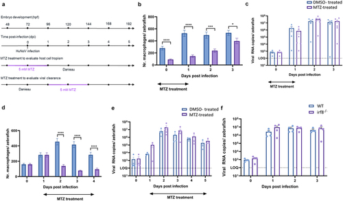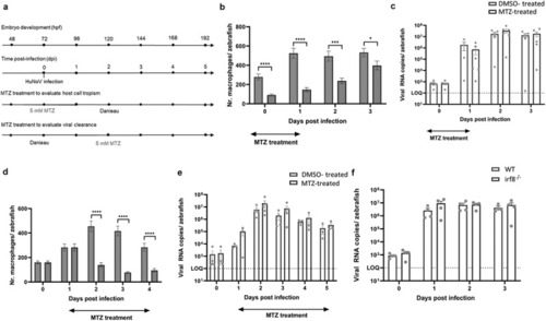 Macrophages are not crucial for either viral replication or viral clearance. (a) Graphical presentation of MTZ treatment schedule before and after infection. (b, d) bars represent the number of macrophages per zebrafish larva of Tg(mpeg1:Gal4/UAS:nfsB-mCherry) quantified using ImageJ software when larvae are treated with DMSO or MTZ to induce chemical ablation of macrophages. |