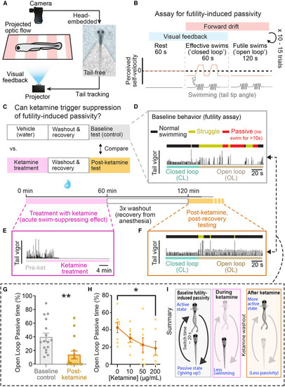 Brief ketamine exposure causes long-term suppression of futility-induced passivity in larval zebrafish (A) Schematic of experimental workflow for imaging swimming behavior in unparalyzed larval zebrafish. (B) Trial structure: 60 s of rest (no stimulus), 60 s of effective swimming (“closed loop,” forward optic flow, visual feedback), then 120 s of futile swimming (“open loop,” forward optic flow, no visual feedback), 10 to 15 repeated trials. (C) Timeline of experiments testing ketamine’s effect on futility-induced passivity. (D) Example trials for vehicle control fish showing tail vigor (rolling-window tail angle standard deviation) across time. Colors above swim trace indicate normal swimming (black), struggle (yellow), and passivity (red). Colors below swim trace indicate closed- (teal) and open-loop (brown) periods. (E) During ketamine treatment, fish tend to become quiescent. (F) After ketamine treatment and washout, example fish swims similarly to vehicle-treated fish in closed loop (cf. D, CL period), but in open loop, they are less passive and more active. (G) Ketamine-treated fish spend less time passive (periods > 10 s with no swimming) than vehicle controls during open loop. Mann-Whitney test, n = 16 fish (control), 15 fish (ketamine), p = 0.0010. (H) Dose-response curve of ketamine’s suppression of open-loop passive time. Mann-Whitney test, n = 8 fish (control), 8 fish (ketamine), p = 0.0289. All error bars denote standard error of the mean (SEM) ∗ p < 0.05 ∗∗ p < 0.01. (I) Summary of findings. |