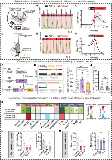 Translational potential and parallels between zebrafish and rodent futility-induced passivity assays (A) A light-sheet microscope recorded from radial astrocytes across the brain at cellular resolution while fictive behavior was monitored, and visual stimulus was delivered. (B) Swim traces (gray, tail vigor) showing active and passive periods and simultaneously recorded hindbrain astroglial calcium signals from an example fish. (C) Average open-loop struggle-triggered jRGECO1a signal in hindbrain glia (n = 3). (D) 2-photon imaging of cortical astrocyte calcium dynamics in the retrosplenial cortex using Aldh1l1-CreER and GCaMP6s mice using a head-mounted miniaturized microscope. (E) Active and passive periods and simultaneously recorded cortical astrocyte calcium signals in the retrosplenial cortex from an example mouse. (F) Average passivity-triggered cortical astrocytic signal. (n = 8). (G) Timeline of experiments testing the effect of chronic hydrocortisone (CORT) treatment on futility-induced passivity in larval zebrafish. (H) Example trials for control fish (K) and hydrocortisone-treated fish (L). Colors above swim trace indicate normal swimming (black), struggle (yellow), and passivity (red). Colors below swim trace indicate closed- (teal) and open-loop (brown) periods. Swim traces indicate tail vigor. (I) CORT-treated fish spend more time passive than vehicle controls during open loop. This effect was reversed by treatment with ketamine. One-way ANOVA with Welch’s correction for multiple comparisons, n = 23 (control), 23 (CORT), and 20 (ketamine-CORT). (CORT vs. control) p = 0.0274, (control vs. CORT-ketamine) p = 0.7266. (J) Average percentage of closed-loop (CL) spent in the passive state. Mann-Whitney test, n = 23 (control), 23 (CORT), p = 0.4453. (K) Open-loop passivity and closed-loop swim rate (“side-effects”) of fish treated with vehicle (control) or various pharmacological compounds (normalized to mean of control) in the futility-induced passivity assay. Results are grouped by major pharmacological target of treatment compound. ∗ Indicates p < 0.05 compared with control. (L) Acute (1 h post-washout) effects of (left) phencyclidine-site NMDA receptor antagonists and (right) 5-HT2A receptor agonists on open-loop passivity. (M) Persistent (24 h post-washout) effects of (left) phencyclidine-site NMDA receptor antagonists and (right) 5-HT2A receptor agonists. All error bars denote SEM. n.s. p > 0.05, ∗ p < 0.05, ∗∗ p < 0.01, ∗∗∗ p < 0.005, ∗∗∗∗ p < 0.001. Statistics for (L) and (M) one-way ANOVA with Tukey’s multiple comparison test (vs. control). (L, left), n = 17 (control), 10 (ketamine), 8 (MK-801), p = 0.0086 (ketamine), and 0.0115 (MK8-801). (L, right) 16 (control), 8 (DOI), 7 (TCB-2), p = <0.0001 (DOI), and 0.0008 (TCB-2). (M, left) n = 8 (control), 8 (ketamine), 8 (MK-801), p = 0.0103 (ketamine), <0.0001 (MK-801). (M, right) n = 16 (control), 8 (DOI), 8 (TCB-2), p = 0.8096 (DOI), and 0.8295 (TCB-2). |