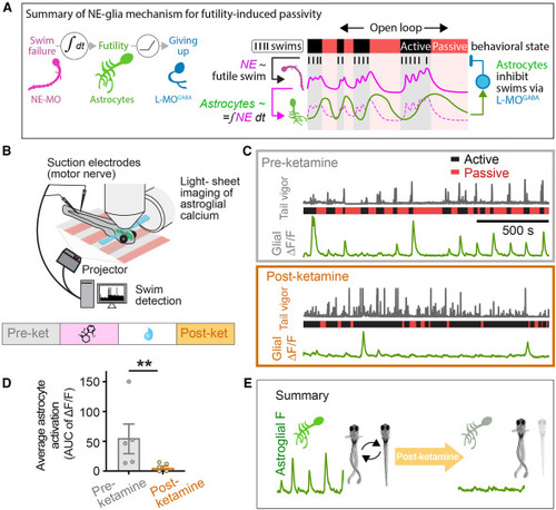 Brief ketamine exposure suppresses subsequent astrocyte calcium responses during futile swimming (A) Summary of mechanism underlying futility-induced passivity in zebrafish, adapted from Mu et al.9 (B) Whole-brain imaging of radial astrocyte calcium during behavior as described in the main text. (C) Swim traces (gray, tail vigor) showing active and passive periods and simultaneously recorded hindbrain astroglial calcium signals from two example Tg(gfap:jRGECO1a) fish either treated with vehicle control (pre-ketamine, top) or ketamine (post-ketamine, bottom). In both cases, fish were allowed to recover for 1 h following washout before recordings were performed. (D) Astrocytes are less active in the open-loop test period after ketamine treatment compared with control, as assessed by comparing the average ΔF/F (area under the curve) of astrocytic calcium after strong-swims before and after ketamine treatment. Mann-Whitney test. n = 5 (pre), 6 (post). p = 0.0087. (E) Summary of findings. Brief ketamine treatment causes, after washout, long-term reductions in passivity and hypo-activation of astrocytes compared with control. |