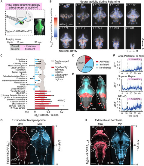 Activation of noradrenergic and serotoninergic populations following acute ketamine (A) Fish expressing the nuclear calcium indicator H2B-GCaMP7f under a pan-neuronal promoter were imaged using a light-sheet microscope before and during acute treatment with ketamine. Micrograph shows orientation of larval zebrafish brain as shown in the following panels. Scale bar, 100 μm. (B) Average activity changes across six registered fish (log-ratio of ΔF/F following ketamine administration to before administration) at different anatomical depths after ketamine treatment. (C) Selected Z-Brain76 areas activated significantly above (red) or below (blue) chance (background shaded region, 95% CI) following ketamine treatment. Chance levels determined through bootstrapping with shuffle indices (nBoot = 10,000). Numbers in parentheses correspond to regions in (E). (D) Proportion of Z-Brain76 areas activated significantly (same statistical assessment as in C) above, below, or at chance following ketamine treatment. A more comprehensive analysis for all areas is shown in Figure S4. (E) Brain areas that were significantly (same statistical assessment as in C) activated or inhibited following ketamine treatment in blue or red overlaid onto the reference atlas fish. Labeled numbers correspond to regions listed in (C). (F) Average neural activity (ΔF/F) of indicated noradrenergic and serotonergic regions across fish (n = 6 fish, top 10% cells for each region per fish). Shaded region denotes SEM. (G) Maximum and minimum values (along the Z-dimension, top-bottom of the brain) for average NE levels across the brain during ketamine exposure imaged using GRABNE2h (n = 2). OT, optic tectum, pMO, posterior medulla oblongata. (H) Maximum and minimum values (along the Z-dimension, top-bottom of the brain) for average 5-HT levels across the brain during ketamine exposure imaged using GRAB5-HT2.0 (n = 4). Ce, cerebellum, Hb, habenula. All scale bars, 100 μm. |