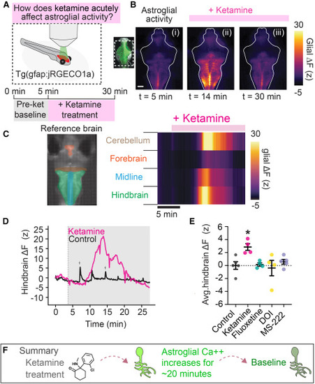 Ketamine triggers a long-lasting calcium elevation in astroglia (A) Fish expressing the calcium indicator jRGECO1a in astroglia were imaged using an epifluorescence microscope before and during acute treatment with ketamine for 30 min. (B) Example fluorescence micrographs of jRGECO1a signal at three time points illustrating elevation and return to baseline of cytosolic calcium in the presence of ketamine. Scale bar, 50 μm. (C) Heatmap of glial jRGECO1a signal in four ROIs (left) for fish in (C). Pink bar indicates ketamine in the bath. (D) Hindbrain jRGECO1a fluorescence change in an example fish treated with ketamine (200 μg/mL) or vehicle (control). Short increases in astrocytic calcium during struggles in control fish are indicated by gray arrowheads. (E) Average hindbrain fluorescence change following treatment with listed compounds. Ketamine, but not fluoxetine (SSRI), DOI (5-HT2AR agonist), or MS-222 (anesthetic), elevates cytosolic astroglial calcium. One-way ANOVA with Tukey’s multiple comparison test (vs. control). n = 5 (control, MS-222), 4 (all other conditions). p = 0.0169 (ketamine), 0.9395 (MS-222), 0.9893 (DOI), 0.9996 (fluoxetine). (F) Summary of findings. |