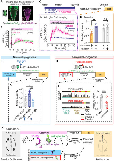 NE-dependent astroglial calcium elevation is required and sufficient for ketamine’s behavioral effects (A) Fluorescence image of a larval zebrafish expressing GRABNE2h under the elavl3 promoter (green) and jRGECO1a (glial Ca2+) under the gfap promoter (pink). Scale bar, 100 μm. (B) Simultaneously imaged intracellular glial Ca2+ dynamics (jRGECO1a signal) and extracellular NE dynamics (GRABNE2h signal). Traces represent mean of fish (n = 8), and shaded regions denote SEM. Shaded region indicates ketamine (200 μg/mL) in bath. (C) Schematic of experiments testing whether ketamine’s effects on astroglial Ca2+ and futility-induced passivity behavior depend on NE signaling. (D) Astroglial Ca2+ (jRGECO1a signal) response to ketamine (200 ug/mL) application in fish treated with 50 μM prazosin (n = 6) or vehicle control (n = 5). (E) Open-loop passivity for fish treated with ketamine, with or without α1 adrenergic blocker prazosin (100 μM). All error bars denote SEM. ∗ p < 0.05, ∗∗ p < 0.01, n.s. p > 0.4. ΔF (Z scored) for each fish was calculated as the difference between mean total fluorescence before treatment subtracted to total fluorescence at a specific time point, divided by the standard deviation of total fluorescence before treatment, for hindbrain mask (D). Two-way ANOVA with Sidak’s multiple comparison test. n = 7 (control-prazosin and ketamine-prazosin), 9 (ketamine-vehicle), 11 (control-vehicle). p = Interaction (0.0140), 0.0057 (ket-prazosin vs. ket-vehicle), 0.9947 (control-vehicle. vs. control-prazosin). (F) Tg(dbh:KalTA4; UAS:CoChR-eGFP) fish expressing the channelrhodopsin CoChR in norepinephrinergic (NE) neurons were continually stimulated optogenetically with blue (488 nm) light for 30 min. Fish were allowed to recover for an hour then assayed for futile swimming. (G) Passivity normalized to clutch, non-stimulated controls. Optogenetic stimulation suppressed futility-induced passivity following recovery compared with non-stimulated clutch controls and non-expression controls stimulated with blue light. One-way ANOVA with Sidak’s multiple comparison test. n = 19 (dbh:CoChr, no light), 14 (wild type, blue light), 13 (dbh:CoChr, blue). p = 0.0004 (WT-Blue light vs. DBH-Blue light), p = 0.0392 (WT-Blue light vs. DBH-no light), p = 0.0392 (DBH-no light vs. DBH-Blue light). (H) Transgenic fish expressing rat TRPV1 in astroglia were treated with capsaicin for 30 min. After 30 min, capsaicin was washed out and fish allowed to recover for 1 h before being tested. (I) Example swimming of capsaicin-treated fish (bottom) and untreated clutch controls (top). Black, yellow, and red segments above swim vigor trace denote regular swimming, struggling, and passivity, respectively. (J) Passivity normalized to untreated clutch controls. Capsaicin-treated fish exhibit decreased futility-induced passivity, although the distribution of passivity duration is bimodal. Mann-Whitney test. n = 22 (control), 19 (capsaicin), p = 0.0005. (K) Summary of findings. |