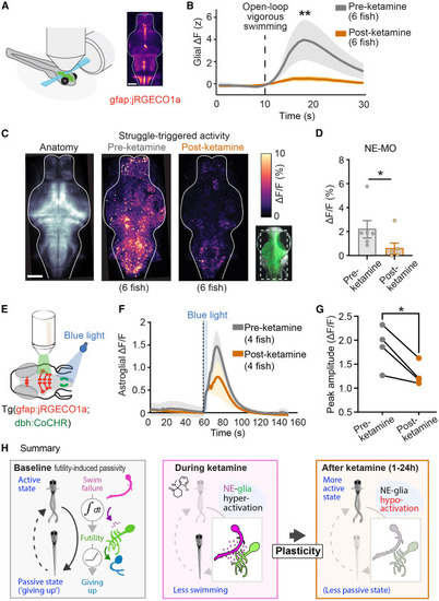 Persistent suppression of futility-activated neuron-astroglial circuits following ketamine exposure (A) A light-sheet microscope recorded from most radial astrocytes and neurons in the brain at cellular resolution (STAR Methods). (B) Astrocyte jRGECO1a signal following standardized strong swims in fish before and treatment with ketamine Same dataset as Figure 3D. Mann-Whitney test. n = 5 (pre), 6 (post). p = 0.0087. (C) Left: anatomical max projection of Tg(elavl3:H2B-GCaMP7f) fish imaged during behavior. (middle) max projection of futile-swim-triggered neural activity of untreated fish (n = 6). Right: max projection of futile-swim-triggered neural activity of ketamine-treated fish shown pre-ketamine and post-ketamine (n = 6). (D) Average struggle-triggered ΔF/F in NE-MO cells before and after ketamine treatment. Mann-Whitney test. n = 6 (pre), 6 (post). p = 0.041. (E) Transgenic fish expressing the channelrhodopsin CoChR in norepinephrinergic (NE) neurons and the calcium sensor jRGECO1a in glia were briefly stimulated optogenetically with blue (488 nm) light for 5 s while recording glial activity. (F) Average ΔF/F traces showing glial calcium responses after NE-MO stimulation with blue light, before (pre-ket) and after (post-ket) ketamine treatment, with different fish for pre/post. (G) Peak amplitude (ΔF/F) following blue light stimulation in the same pre-ket and post-ket fish. Two-tailed paired t test. n = 4 pairs. p = 0.0268. All error bars denote SEM. ∗ p < 0.05, ∗∗ p < 0.01. (H) Summary of findings. |