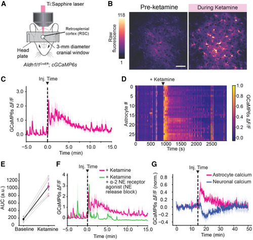 Ketamine elevates astrocytic calcium in mammalian astrocytes in vivo through conserved signaling pathways (A) Schematic showing setup for in vivo imaging of cortical astrocytic calcium in awake mice. (B) Fluorescence micrographs of GCaMP6s signal in the retrosplenial cortex (RSC), for an example mouse at two time points illustrating elevation of cytosolic calcium following IP injection of 20 mg/kg ketamine. Scale bar, 50 μm. (C) Average RSC ΔF/F trace in response to 20 mg/kg ketamine (n = 6), injected at 15 min (dotted line). (D) ΔF/F for individual astrocytes over time in response to 20 mg/kg ketamine (black arrow). (E) Quantification of RSC fluorescence change before and after ketamine injection, normalized to control. Paired two-tailed test. n = 6. p = 0.0003. (F) Average RSC ΔF/F trace for mice injected with 20 mg/kg ketamine or 20 mg/kg ketamine plus 0.05 mg/kg of an alpha-2 agonist, dexmedetomidine. n = 5. ∗∗ p < 0.01. (G) Average RSC ΔF/F trace for astrocytes (pink) and excitatory neurons (blue) in response to 20 mg/kg ketamine, injected at 15 min (dotted line) using Aldh1l1-CreER;GCaMP6s;Thy1-jRGECO mice. n = 4. |