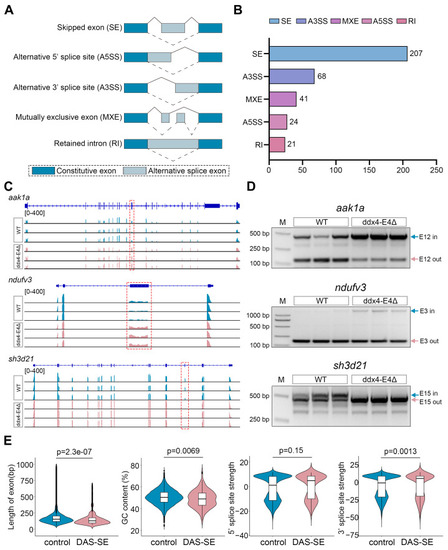 Identification of differential alternative splicing events between WT and ddx4-E4Δ zebrafish ovaries. ( |