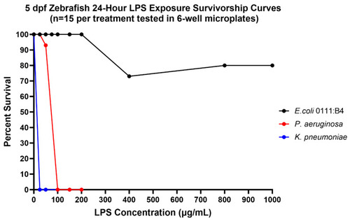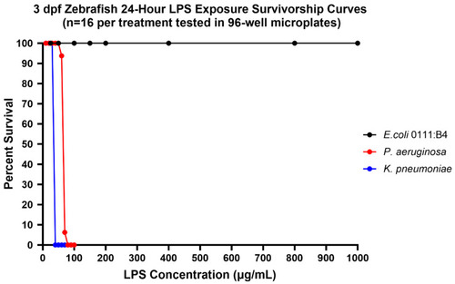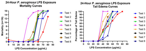 LPS concentration response curves for replicate tests during the optimization phase of assay development. The left graph depicts the percentage of fish with tail edema in response to increasing |