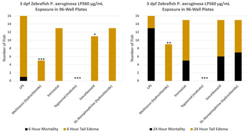Example of the rescue results from the initial drug screening from a single 96-well plate. Tegaserod showed complete rescue from LPS-induced tail and edema and mortality (n = 16 for each test condition). * = PHENOTYPE: