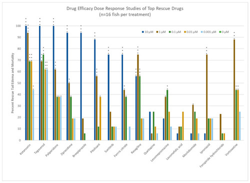 Drug efficacy concentration range response curves for the top 16 rescue drugs. * = PHENOTYPE: