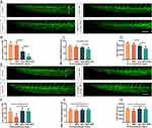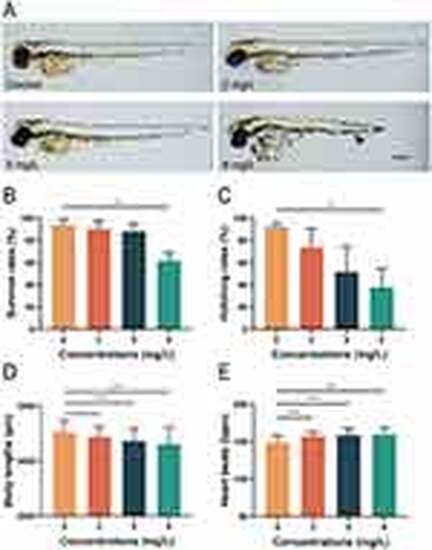 Toxicity of NPs on zebrafish embryonic development. (A) Morphological changes in zebrafish embryos exposed to varying NPs concentrations at 72 hpf. Black arrows indicate abnormal tail morphology. (B) Survival rates of zebrafish embryos treated with NPs at 72 hpf (n = 100). (C) Hatching rates of zebrafish embryos exposed to NPs· at 72 hpf (n = 100). (D) Body lengths of zebrafish embryos exposed to NPs at 72 hpf (n = 90). (E) Heart rates of zebrafish embryos treated with NPs at 48 hpf (n = 30). Data are presented as mean ± SD. Asterisks indicate statistical significance (*P < 0.05; **P < 0.01; ***P < 0.001). Scale bar = 100 μm. |