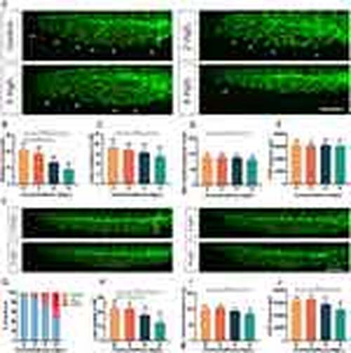 Exposure to NPs leads to developmental defects in the CVP of Tg(kdrl:eGFP) embryos. (A) Representative images of CVP developmental malformations in Tg(kdrl:eGFP) embryos treated with NPs at 30 hpf. (B-E) The numbers of filopodia (B), numbers of loop (C), maximum ventral extension distance (D) and area (E) of CVP in Tg(kdrl:eGFP) embryos after quantified NPs treatment at 30 hpf (n = 30 embryos). (F) Representative images of CVP developmental malformations in NPs-treated Tg(kdrl:eGFP) embryos at 48 hpf. (G) The malformation rate of CVP in Tg(kdrl:eGFP) embryos after quantified NPs treatment at 48 hpf (n = 30 embryos). (H-J) The numbers of loop (H), maximum ventral extension distance (I) and area (J) of CVP in Tg(kdrl:eGFP) embryos after quantified NPs treatment at 48 hpf (n = 30 embryos). White arrowheads, sprouts; red asterisks, loop structure; white vertical line, maximum ventral extension distance. Data are shown as mean ± SD. An asterisk above each bar indicates statistical significance (*P<0.05; **P<0.01; ***P<0.001). Scale bar, 100 μm. |