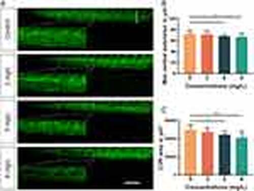 Exposure to NPs causes permanent defects in the CVP of Tg(kdrl:eGFP) embryos. (A) Representative image of permanent defects in the CVP of Tg(kdrl:eGFP) embryos due to exposure to NPs. (B, C) The maximum ventral extension distance (B) and area (C) of larval CVP after quantified NPs treatment (n=30 embryos). White line, maximum ventral extension distance. Data are shown as mean ± SD. An asterisk above each bar indicates statistical significance (*P<0.05; **P<0.01; ***P<0.001). Scale bar, 100 μm. |