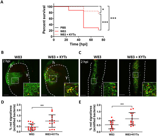 Inactivation of gingipains by KYT inhibitors increases larvae survival and increases phagocytosis of wild-type W83 (A) Kaplan-Meier survival plot of zebrafish larvae (30 hpf) infected with wild-type |