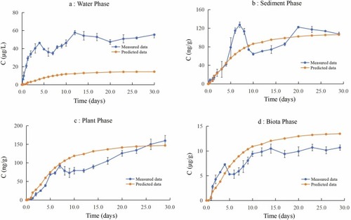 (a–d) Measured (squares and triangles) vs. predicted (dotted line) concentrations of BPA in the aquatic microcosm as a function of time. |