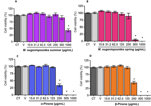 Cytotoxicity of (A) Marlierea eugeniopsoides summer, (B) M. eugeniopsoides spring, (C) α-pinene, and (D) β-pinene to PC-12 cells. All experiments were performed in triplicate (n = 3). Results were expressed as mean ± standard error mean (SEM). Experimental groups were compared by one-way ANOVA (Dunnett's posttest), with *p < 0.05 as the significance criteria. |