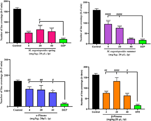 Effect of Marlierea eugeniopsoides oil (spring and summer) and the constituents α-pinene and β-pinene on the locomotor behavior of adult zebrafish in the open field test (0–5 min). The values represent the mean ± standard error of the mean for 6 animals/group; one-way ANOVA followed by Tukey's test: (****p < 0.0001 vs. control; #p < 0.05, ##p < 0.01, ####p < 0.0001 vs. DZP). |