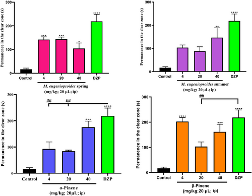 Effect of Marlierea eugeniopsoides oil (spring and summer) and the constituents α-pinene and β-pinene on zebrafish anxiety in the light/dark test (0–5 min). The values represent the mean ± standard error of the mean for 6 animals/group; one-way ANOVA followed by Tukey's test (*p < 0.05, **p < 0.01, ***p < 0.001, ****p < 0.0001 vs. control; ##p < 0.01 vs. DZP). |