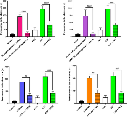 Effect of Marlierea eugeniopsoides oil (spring and summer) and the constituents α-pinene and β-pinene on GABAergic neuromodulation in zebrafish in the light/dark test (0–5 min). The values represent the mean ± standard error of the mean for 6 animals/group; two-way ANOVA followed by Tukey's test. (##p < 0.01, ###p < 0.001, ####p < 0.001 vs. DZP + FMZ or α-pinene + FMZ or β-pinene + FMZ or M. eugeniopsoides oil [spring] + FMZ or FMZ + M. eugeniopsoides oil [summer]). |