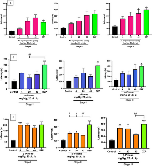 Effect of Marlierea eugeniopsoides oil (spring) (A) and the constituents α-pinene (B) and β-pinene (C) on PTZ-induced seizures in zebrafish, diazepam (DZP; 4 mg/kg) the positive control. The values represent the mean ± standard error of the mean for 6 animals/group; one-way ANOVA followed by Tukey's test. Control (DMSO 3%; 20 µL; vo); DZP—Diazepam (4 mg/kg; ip) (*p < 0.05, **p < 0.01, ***p < 0.001, ****p < 0.0001 vs. control; #p < 0.05, ##p < 0.01 vs. DZP). |