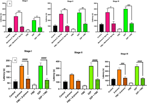 Effect of Marlierea eugeniopsoides oil (spring) (A) and β-pinene (B) on PTZ-induced seizures in zebrafish, diazepam (DZP; 4 mg/kg) the positive control. The values represent the mean ± standard error of the mean for 6 animals/group; two-way ANOVA followed by Tukey's test. Control (DMSO 3%; 20 µL; vo); DZP—Diazepam (4 mg/kg; ip). (*p < 0.05, **p < 0.01,***p < 0.001, ****p < 0.0001 vs. control; #p < 0.05, ##p < 0.01 vs. DZP). Os valores representam a média ± erro padrão da média (E.P.M.) para 6 animais/grupo. ANOVA seguida de Tukey (#p < 0.05, ##p < 0.01 ###p < 0.001, ####p < 0.0001 vs. FMZ + DZP or FMZ + M. eugeniopsoides oil (spring) or FMZ + β-pinene). |