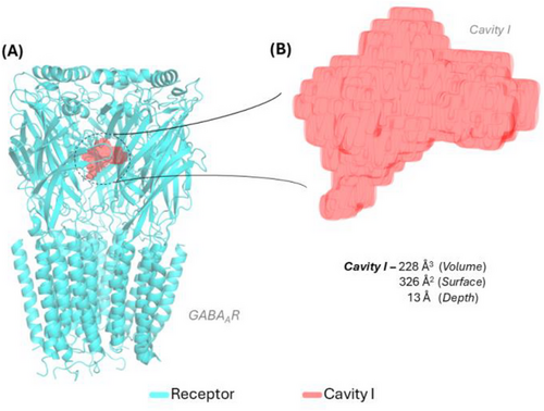 Cavity prediction for the target receptor GABAAR (A) global view of the system formed by the biological receptor and the predicted cavity (B) enlargement of Cavity I, presented with its respective values of volume, surface area, and depth. |
