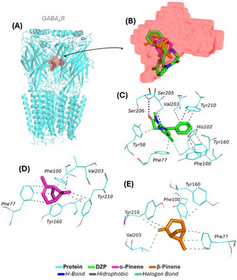 Molecular docking with the GABA receptor. (A) Complexes formed between the ligands associated with Cavity I. (B) Enlargement of the cavity with the respective ligands. (C) Interactions formed by the presence of the DZP inhibitor. (D) Contributions of α-pinene. (E) Interactions formed by the β-pinene compound. |
