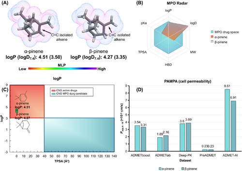 (A) Molecular lipophilicity potential (MLP) surface map, (B) drug-likeness scoring radar based on the MPO system from Pfizer Inc., (C) alignment between lipophilicity (logP) and polarity (TPSA) for CNS activity estimation (Pfizer rule), and (D) PAMPA prediction based on Papp,A→B Caco-2 descriptors (in cm/s) in different databases. |