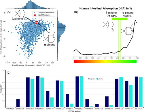 (A) AI-guided similarity testing with compounds deposited in the DrugBank database with alignment between cell effective permeability and drug clearance, (B) estimation of human intestinal absorption (HIA), and (C) prediction of inhibition probability and affinity with CYP450 isoenzymes. |