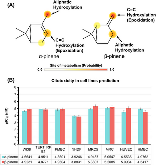 (A) Prediction of the site of metabolism and identification of epoxidation centers and (B) prediction of pIC50 in non-tumor cell lines to predict the cytotoxic response of α-pinene and β-pinene derivatives. |