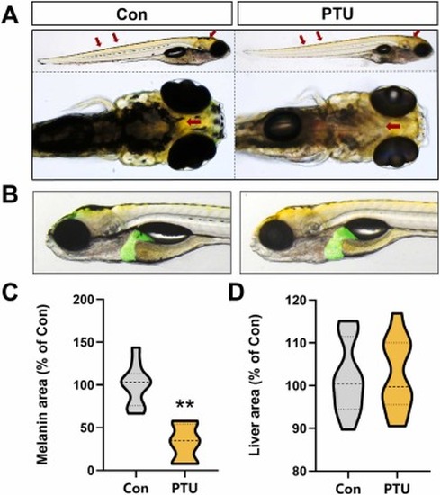 Effect of 200 μM PTU on zebrafish: (A): Zebrafish melanogenesis; red arrows indicate melanin. (B): Zebrafish liver morphology; green fluorescence indicates the liver. (C): Zebrafish head melanin area statistics (n = 15). (D): Zebrafish liver area statistics (n = 15). * *p < 0.01 vs. Con. |