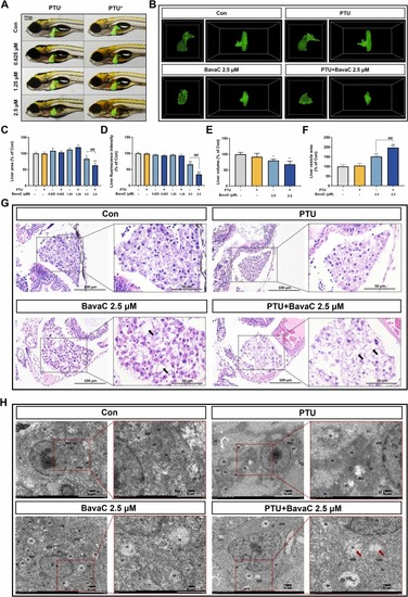 Effect of PTU combined with BavaC on the morphology, pathological structure and ultrastructure of zebrafish livers: (A): Zebrafish liver, 2D morphology. (B): Zebrafish liver, 3D morphology. (C): Zebrafish liver area statistics (n = 15). (D): Zebrafish liver fluorescence intensity statistics (n = 15). (E): Zebrafish liver volume statistics (n = 15). (F): Zebrafish liver vesicle area statistics (n = 5). (G): HE-stained pathological tissue sections; black arrows indicate vacuoles. (H): Ultrastructural electron microscopy images of the nucleus (N), mitochondria (M), rough endoplasmic reticulum (RER), lysosome (Ly) and autolysosome (ASS); red arrows indicate diseased mitochondria. *p < 0.05 vs. Con, * *p < 0.01 vs. Con, ##p < 0.01 vs. BavaC 2.5 μM. |