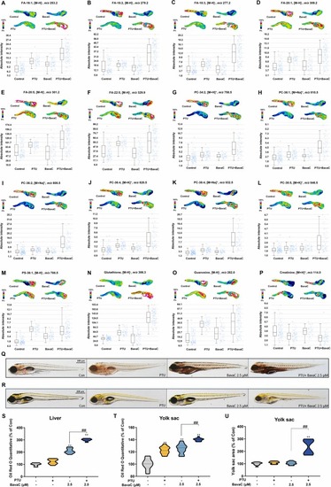 Effect of PTU combined with BavaC on endogenous metabolites and oil red O staining in zebrafish: (A-P): MALDI-MS images and metabolite expression level statistics. (Q): Oil red O staining; the red line indicates the liver, and the white line indicates the yolk sac. (R): Bright field images of zebrafish; the white line indicates the yolk sac. (S): Quantitative statistics of the oil red O staining results for the liver (n = 10). (T): Quantitative statistics of the oil red O staining results for the yolk sac (n = 10). (U): Statistics of the yolk sac area (n = 15). * *p < 0.01 vs. Con, ##p < 0.01 vs. BavaC 2.5 μM. FA: fatty acids; PC: phosphatidylcholine; PS: phosphatidylserine. |