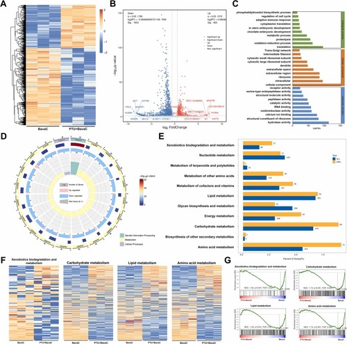 Effect of PTU combined with BavaC on gene expression profiles in zebrafish: (A): Cluster map of differentially expressed gene groups. (B): Volcano plot of differentially expressed genes. (C): GO enrichment analysis plot of differentially expressed genes. (D): Circle plot of the KEGG enrichment analysis. (E): KEGG enrichment bar chart for differentially expressed genes. (F): GSEA gene group cluster map. (G): GSEA enrichment map. |