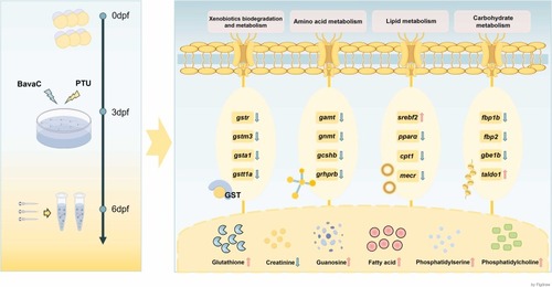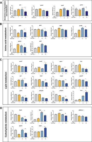 Effect of PTU combined with BavaC on metabolic pathway-related gene expression levels: (A): Xenobiotic biodegradation and metabolism-related gene expression levels. (B): Amino acid metabolism-related gene expression levels. (C): Lipid metabolism-related gene expression levels. (D): Carbohydrate metabolism-related gene expression levels. *p < 0.05 vs. Con, * *p < 0.01 vs. Con, #p < 0.05 vs. BavaC 2.5 μM, ##p < 0.01 vs. BavaC 2.5 μM. |