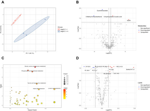 adgrl3.1 mutants and WTs have distinct whole-body metabotypes. (A) Principal component (PC) analysis score plot differentiating metabolomes of adgrl3.1 mutant (red) and WT (blue) zebrafish larvae. The 2 components explained 81.4% of the overall variation, showing clear separation between groups. Each group consisted of 3 biological replicates, with 50 pooled larvae per replicate. (B) Volcano plot of identified metabolites. Blue dots indicate significant downregulation, red dots significant upregulation, and gray dots nonsignificant changes. Comparison between adgrl3.1 mutants and WTs revealed 4 differential metabolites, 2 downregulated and 2 upregulated. Differential metabolites were identified through an FC of ≥1.2 or ≤0.83 and an FDR-adjusted P value of ≤.05. (C) Metabolic pathways detected in adgrl3.1 mutant and WT zebrafish larvae. Five metabolic pathways were classified as both statistically significant (P ≤ .05) and high-impact (impact factor ≥0.5); these pathways are marked with their names. Significantly altered pathways were identified through quantitative enrichment analysis using the KEGG pathway database. (D) Volcano plot of identified lipids. Blue dots indicate significant downregulation, red dots significant upregulation, and gray dots nonsignificant changes. Comparison between adgrl3.1 mutants and WTs revealed 10 significantly altered lipids, 3 downregulated and 7 upregulated. Significantly altered lipids were identified through an FC of ≥1 or ≤0.5 and an FDR-adjusted P value of ≤.05. PHENOTYPE: