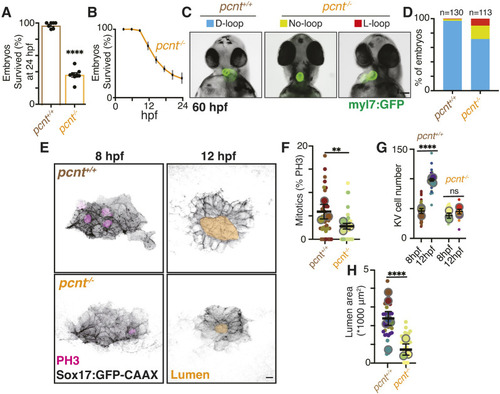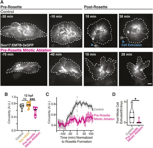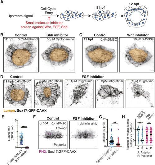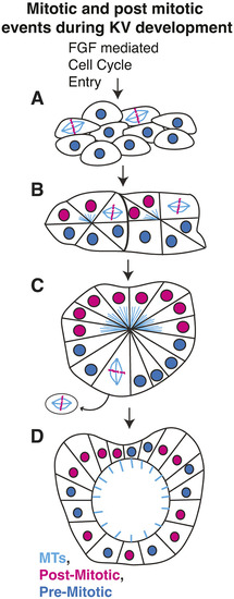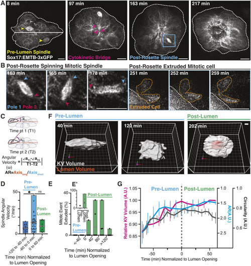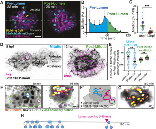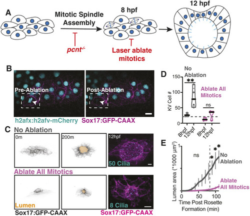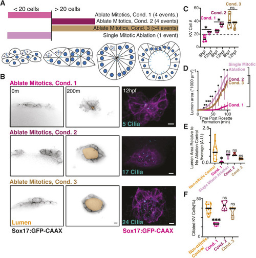 Early KV developmental mitotic events hold greater significance to KV development compared to later KV mitotic events. (A) Model illustrating laser ablation conditions during KV development. Pale blue lines represent cilia. (B) Confocal projections taken from a movie acquisition (0-200 min, left; Sox17:GFP-CAAX, inverted gray; lumen, gold; see also Movie 5). The embryos were then fixed at 6SS (12 hpf) and stained for cilia (acetylated tubulin, cyan, right; Sox17:GFP-CAAX in magenta). The number of cilia in each representative image is noted. m, min. Scale bars: 10 μm. (C) Truncated violin plot depicting the number of KV cells at 8 hpf and 12 hpf for ablation conditions 1, 2 or 3 across n≥3 embryos (each point represents a single embryo). Median denoted with black line and 20 KV cell threshold demonstrated with gray dashed line. *P<0.05 (unpaired, two-tailed Student's t-test); ns, not significant. (D) Lumen area was measured over time for over 100 min for ablation conditions 1, 2, 3, or a single mitotic cell ablation. n≥3 embryos measured per condition. Error bars represent s.e.m. *P<0.05, **P<0.01, ***P<0.001 (one-way ANOVA with Dunnett's multiple comparison); ns, not significant. (E,F) Truncated violin plots depicting KV lumen area (12 hpf; E) and percentage of ciliated KV cells (F). n≥3 embryos for each condition. *P<0.05, ***P<0.001 (one-way ANOVA with Dunnett's multiple comparison to non-mitotic ablation controls); ns, not significant. A.U., arbitrary units; Cond., condition.