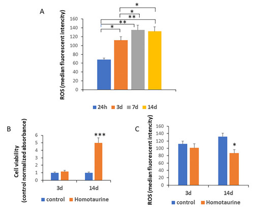 Assessment of ROS levels, MSC viability, and the effect of homotaurine treatment during a 14-day period. ( |