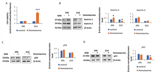 Effect of homotaurine on cell viability, sestrin expression, and cell cycle regulators in MSCs at 24 h and 21 days of treatment. ( |