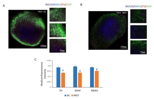 Expression of neuronal markers in 3D neuronal epithelial stem cell (NESC) organoids derived from induced pluripotent stem cells (iPSCs) carrying the leucine-rich repeat kinase 2 (LRRK2) G2019S mutation. ( |